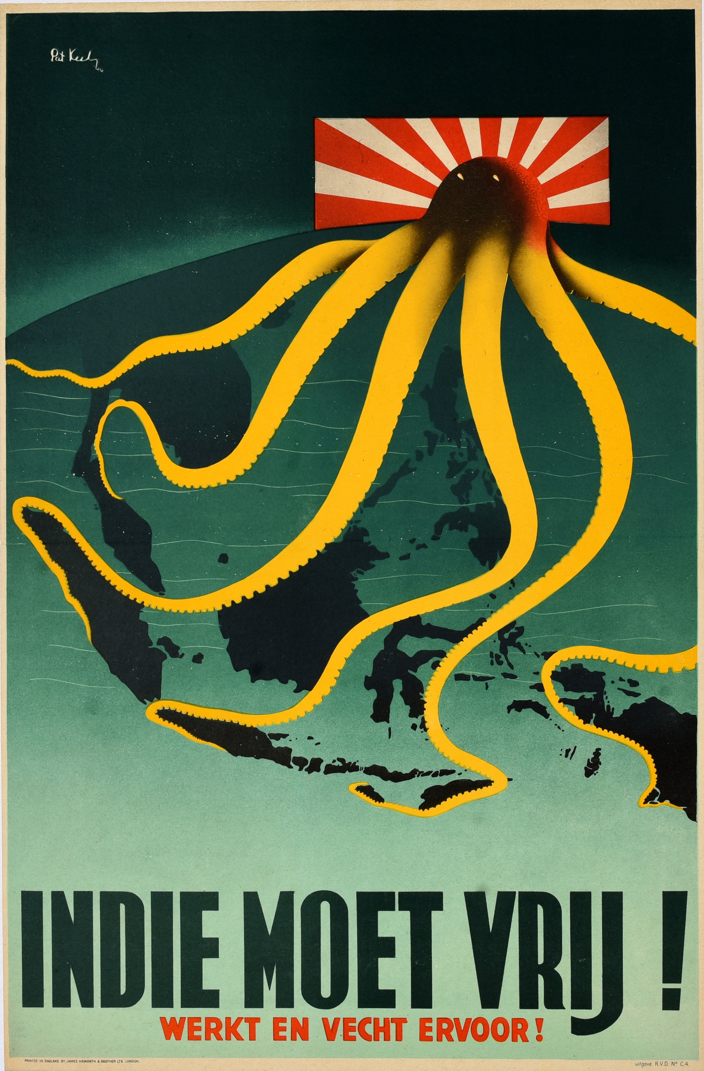 Original vintage World War Two poster issued towards the end of the war in the UK to be displayed in the Netherlands - Indie Moet Vrij! Werkt En Vecht Ervoor! / The Indies shall be freed! Work and fight for it! - featuring a great design by the notable British artist Pat Keely (Patrick Cokayne Keely, d. 1970) depicting a yellow octopus with a Japanese rising sun flag at its head, spreading its tentacles across the Dutch colonies in South East Asia. (A similar poster in France apparently showed Churchill as the octopus.) Good condition, restored tears, staining, backed on linen.