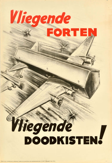Original vintage Dutch World War Two propaganda poster printed in Nazi occupied Holland to instil the idea that American bombers were recklessly killing civilians - Vliegende Forten Vliegende Doodskisten! / Flying Fortresses Flying Coffins! - featuring a dynamic design in grey of US Boeing B-17 Flying Fortress bomber planes with coffins as the main body flying at speed past falling bombs and explosions, the text in bold stylised red and black lettering above and below. Good condition, creasing, staining, tears.