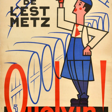 Original vintage alcohol drink advertising poster for Metz Eastern Cellars What a Wine! / Caves de l'Est Metz Quel Vin! Great design featuring an illustration of a winemaker in a blue apron holding up a glass of red wine with a row of barrels in the cellar in the background, the line of the Q in the bold red slogan lettering below formed from the barrel tap with the title text in black letters above. Printed by Leon Louis & Cie Boulay. Good condition, creasing, tears, staining, pinholes, browning.