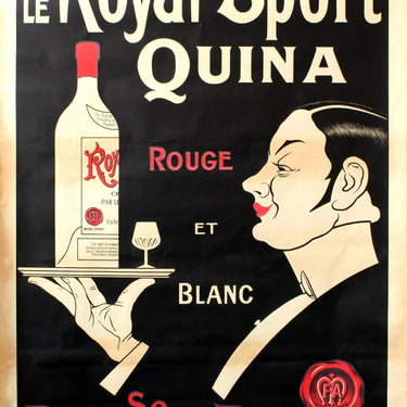 Original vintage alcohol drink advertising poster for a French wine and liquor aperitif - Royal Sport Quina Red and White enjoyed everywhere / Le Royal Sport Quina Rouge et Blanc Se deguste partout - featuring a great image in black and white of a waiter holding up a tray with a bottle of Royal Sport and a small glass on it, the text in stylised white and red letters. Printed by Imp. du Royal Sport. Large size. Good condition, creases and small tears in margins.
