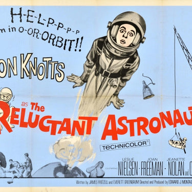 Original vintage movie poster for an American family comedy film The Reluctant Astronaut directed by Edward Montagne and starring Leslie Nielsen as Major Fred Gifford and Don Knotts in the lead role as Roy Fleming, an amusement park children's ride operator hired as a janitor at the NASA Manned Spacecraft Center in Houston who ends up going into space despite his fear of heights. Fun illustration depicting a man in a spacesuit flying into space from earth with the caption H-e-l-p-p-p-p I'm in O-Or-Orbit!! on the side above the bold stylised title text - Don Knotts as The Reluctant Astronaut - depicting a caricature of an astronaut holding onto the red letter R, a spaceman hanging in an inflatable lifeboat raft lifted by a crane on the other side and smaller images of scenes from the movie below with the credits text, set on a light blue background. Horizontal. Good condition, folds, creasing, staining, small tears.
