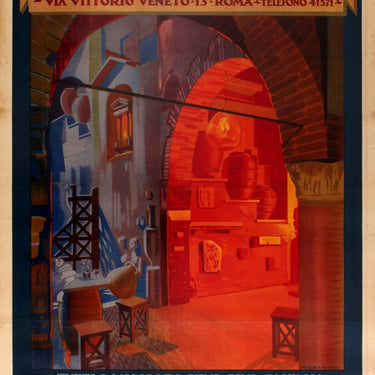 Original vintage advertising poster for a restaurant in Rome - the Dalla Rupe Tarpea alle Grotte d'Enotria / with the wine Caves of Enotria at via Vittorio Veneto 15 Roma - featuring an old archway leading to a glowing room with wooden tables on top of drink barrels, stools and large pots outside, the ancient Roman style text above and below including a list of features - Tutti i migliori vini fini d'italia, Specialita vini da dessert per le feste, Buffet, Freddo, Ottima, Cucina Romana, Orchestra, Aperto Fino Ad Ora Inoltrata / All the best fine wines of Italy, Special dessert wines for parties, Cold buffet, Excellent Roman cuisine, Orchestra, Open now. Large size. Good condition, restored folds, staining in margin, backed on linen.