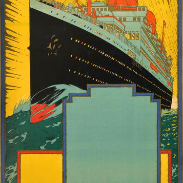 Original vintage cruise travel advertising poster for Royal Mail Line featuring a great design by the British maritime artist Kenneth Denton Shoesmith (1890-1939) depicting an ocean liner ship with red funnels and different coloured lights shining from the windows sailing across the choppy blue sea at speed in front of a dynamic bold yellow sky background, two blank yellow and blue information boxes below not filled in with details of the times and destinations, decorated with the diagonal red cross and crown house flag of the company in the corners. Royal Mail Lines (1932-1965) was a leading cruise ship operator formed following the liquidation of The Royal Mail Steam Packet Company (founded 1839); in 1965 it was acquired by the British transport operator Furness Withy & Company (1891-1980). Good condition, restored tears, backed on linen.