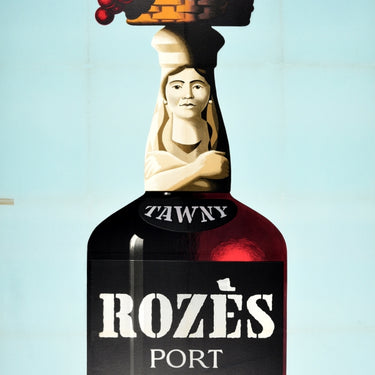 Original vintage alcohol drink advertising poster for Rozes Port featuring an image of a lady carrying a basket of red grapes on her head at the top of a bottle of port wine against a pale blue background, the label reading: Tawny Rozes Port Produce of Portugal Vila Nova De Gaia Oporto. Large size. Good condition, restored folds, restored tears, restored paper losses, tape marks, staining, paper stamp, ink stamp, backed on linen.