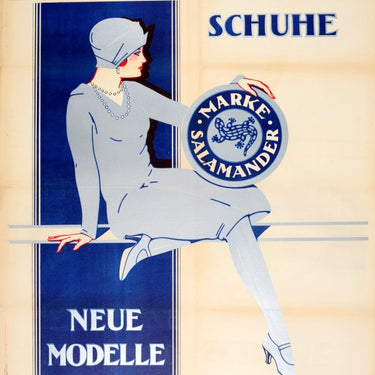 Large original vintage Austrian advertising poster for Salamander shoes featuring a great Art Deco design primarily in blue and grey of a fashionably dressed young lady wearing an elegant dress, hat, jewellery and Salamander shoes and holding a Salamander brand logo with the stylised text above and on the left: Salamander Schuhe – Neue modelle / Salamander Shoes – New Model. Printed by F. Adametz, Wien. Good condition, restored folds and minor loss on top margin, backed on linen.