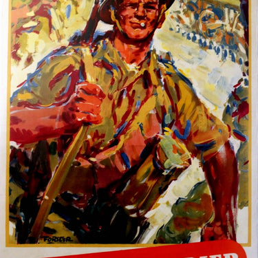 Original vintage World War Two poster: Salute the Soldier - Save More, Lend More - featuring a soldier marching with a rifle over his shoulder and a cigarette in his mouth, more soldiers and a tank in the background. Printed by Chromoworks London. Good condition, creasing, light tape marks in the corners, minor tears on margins.