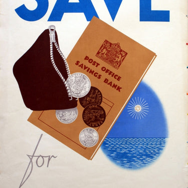 Original vintage poster featuring coins next to a purse and a Post Office Savings Bank book with the sun and sea in the background and the slogan "Save for the days ahead", issued by the Post Office and printed by Fosh & Cross Ltd., London.