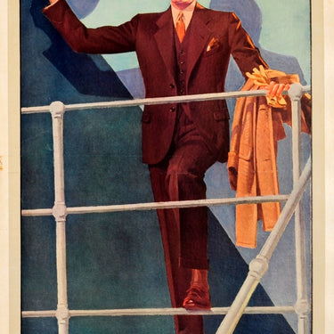 Original vintage men's fashion advertising poster for Schloss Bros. & Co. American department store located in Baltimore and New York specialising in men's suits. Great illustration featuring a smartly dressed young man wearing a brown suit with a waistcoat and an orange tie, smiling while raising his hat and standing with one foot on metal railings, as if greeting someone from a ship on arrival. Good condition, restored folds, restored tears on image, small restored paper losses, restored creasing, minor staining, backed on linen.