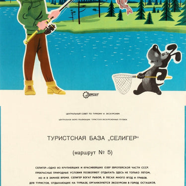 Original vintage Soviet travel poster for Seliger Lake featuring a fun and colourful illustration of a bearded man wearing a green jacket, hat and sunglasses and holding a fishing rod up to drop a fish into a net being held by his dog next to the river with green grass and trees in the background, the description below: Seliger - One of the largest and most beautiful European lakes of the USSR. Perfect natural conditions allow you to relax here not only in summer, but in winter time. Seliger is rich in fish and the forests have many herbs and mushrooms. For tourists, staying at the tourist base, excursions to the city are organised and hikes to the source of the Volga river and the lake shores. Travels to this and other routes can be purchased in the tourist agencies in your city or region. Good condition, creasing, tears.