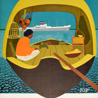 Original vintage Asia cruise ship travel poster - Singapore American President Lines Serving 50 ports on 4 major trade routes - featuring a great illustration showing a lady sitting under the cover of a traditional wooden twakow boat with an oar in the water, fruit and fishing cage on the boat and view of a sleek ocean liner sailing by on the blue sea and sky background, the bold title in stylised red and white letters above and rest of the text below. Very good condition, minor creasing, minor staining, backed on linen.