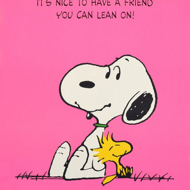 Original vintage poster featuring the iconic comic character Snoopy the Dog by the notable American cartoonist Charles M. Schulz (Charles Monroe Schulz; 1922-2000) - It's nice to have a friend you can lean on! Fun cartoon design featuring Snoopy and Woodstock the bird sitting happily together back to back, Snoopy smiling at the viewer with the quote above, set against a pink background. Good condition, restored pinholes, restored paper skimming, staining, backed on linen.