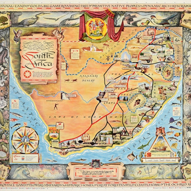Original vintage pictorial map of South Africa designed and drawn in Pretoria South Africa by Bernard Sargent (Bernard Maurice Sargent; 1921-2011) "Showing the diverse places and extraordinary manner of strange things to be seen by those who voyage to this land beloved of the sun and who travel about therein for their pleasure" featuring annotated illustrations including animals and birds - antelopes, rhinos, zebras, giraffes, lions, pelicans etc. - fruit and flowers, waterfalls, farming, historic landmarks, resorts, national parks, mountains, caves, routes, rivers and territories - the Kalahari Desert, Cape of Good Hope, Basuto Land, Orange Free State, Transvaal, Bushmanland, Natal, Bechuan Aland etc. - with decorative descriptions of tourist attractions - big game roaming and fishing, native peoples, skyscraper cities, vineyards, historic homes, great forests and wild coasts, with a penguin in the centre of the compass point above the legend and a ship with an image of "Bartholomew Diaz discovered the Cape and erected a cross in 1487" above the scale of miles and a quote "This Cape is a most stately thing and the most fairest Cape we saw in the whole circumference of the earth" by Sir Francis Drake with the coat of arms above in front of a theatrical curtain, set within a decorative border. Designed and drawn in Pretoria South Africa, Printed in Holland and Published by the South African Tourist Corporation. Horizontal. Good condition, restored folds, backed on linen.