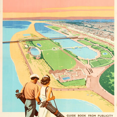 Original vintage travel poster advertising the popular seaside resort town of Southport in north west England featuring an aerial view over Southport and the Lancashire Coast below a dramatic sky including the rollercoaster and other entertainment rides at Southport Pleasureland (1913-2006; reopened in 2007 as New Pleasureland), Princes Park and the historic Southport Pier (opened 1860; the country's oldest iron pier and second longest pier after Southend Pier) with sailing boats on the marina, cars driving by, small planes on the sandy beach and the town in the distance, a man and lady walking in the foreground with their golf clubs next to the further information on train tickets and tourist information with the British Railways logo. Artwork by Verney L. Danvers (1895-1973). Printed by McCorquodale, Glasgow. Very good condition, creasing on margin, light fold marks.