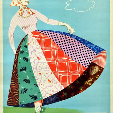 Original vintage advertising poster issued by the Ministry of Trade of the RSFSR Russian Soviet Federative Socialist Republic. The design features a smiling young lady wearing a white and pink striped shirt and a colourful skirt in different patterns sewn together to show off the latest fashion trends, a polka dot headscarf and a pearl necklace, standing on green grass with her skirt billowing out in the wind against the sky blue background, the Rostextiletorg Ministry heading above a single cloud and the bold title text in Russian below: Штапельные ткани красивы, практичны, хорошо драпируются. Из них можно сшить элегантное платье или платье-костюм для женщин любого возраста / Staple fabrics are beautiful, practical, drape well. From them, you can sew an elegant dress or dress-suit for women of any age. Very good condition, minor browning on margins.
