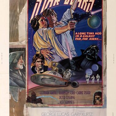 Original vintage movie poster for the classic film directed by George Lucas, Star Wars: Episode IV - A New Hope, starring Mark Hamill as Luke Skywalker, Harrison Ford as Han Solo, Peter Mayhew as Chewbacca, Carrie Fisher as Princess Leia, Alec Guinness as Obi-Wan Kenobi, David Prowse as Darth Vader, Anthony Daniels as C-3PO and Kenny Baker as R2-D2. "A long time ago in a galaxy far, far away..." 'Style D' poster design by Charles White III and Drew Struzan featuring the title text with Luke Skywalker and Princess Leia, C3PO and R2 D2, Darth Vader, Han Solo and Chewbacca in the foreground, as if the poster was pasted on wood, and the face of Obi-Wan Kenobi still visible on a torn poster style image behind it. Released in 1977, this movie was the first episode of the original Star Wars trilogy. Good condition, minor restoration to fold lines, backed on linen.