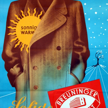 Original vintage fashion advertising poster for Sunshine Warmth - winter Solide Coats. Great design on a blue background featuring a man's warm coat with dynamic straight lines running to snow falling and an icy tree in the background. Good condition, folds.
