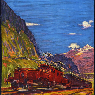 Original vintage travel advertising poster for Switzerland The St. Gothard Electric Railway featuring scenic artwork by Daniele Buzzi (b 1890) depicting a locomotive train on a track in front of snow topped mountains and hills with a village visible in the background below the blue sky, the bold stylised text on the margin above and below. Opened in 1882, the alpine Gotthard Railway line runs north-south through Switzerland and the Gotthard Tunnel from Ticino to Immensee; the line was electrified in 1922. Published by the Swiss Federal Railways Berne. Printed by J.E. Wolfensberger Zurich. Good condition, restored paper loss on top left corner, restored pinholes, minor tears and light creasing, backed on linen.