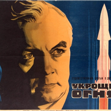 Original vintage Soviet film poster for an epic historical drama film - Taming of the Fire / Укрощение огня - based on a true story about Sergei P. Korolev (1907-1966) and the Russian space programme and missile industry he founded, from the 1920s to the first man in space (Yuri Gagarin) in 1961. Fantastic image of a man in the centre with a lady standing with her back turned on the left side and a rocket being launched on the right with the text in stylised black and white letters. Horizontal. Fair condition, tears, paper loss on margins, creases and folds.
