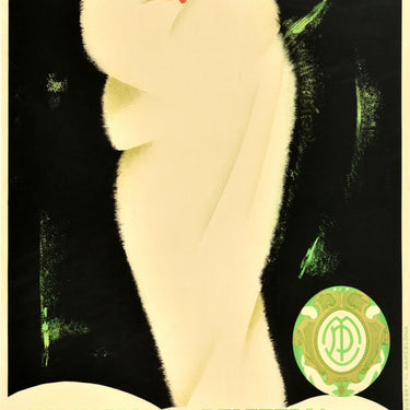 Original vintage Spanish clothing advertising poster - Industrias de Peleteria Tapbioles y Pirretas Fur Industry Barcelona - featuring an elegant Art Deco design by the Czech artist Karel Cerny (1910-1960) depicting a fashionably dressed lady in white fur on a black and green background, the title text and logo below. Printed by Rieusset, Barcelona. Large size. Good condition, restored paper losses, small paper losses on edges, restored tears, staining, backed on linen.