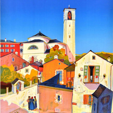 Original vintage travel poster advertising Ticino / Tessin Svizzera Suisse Southern Switzerland Schweiz featuring a colourful view from a balcony over the town's skyline with people chatting and the church bell tower rising into the blue sky above. Printed by A Trub a Cie Aarau Lugano. Very good condition, creasing on edges, small tears on edges.