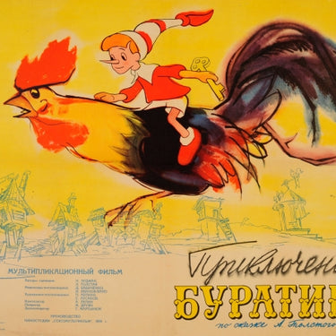 Original vintage movie poster for the award winning Soviet animated children's film The Adventures of Buratino / Приключения Буратино based on The Golden Key (or The Adventures of Buratino) by Aleksey Nikolayevich Tolstoy about a Pinocchio boy made of wood called Buratino (meaning Puppet in Italian) cut out from a log by Carlo the organ grinder and directed by Ivan Ivanov-Vano (Ivan Petrovich Ivanov-Vano; 1900-1987), known as the "patriarch of Russian animation" with Dmitriy Babichenko and Mikhail Botov. Fun and colourful cartoon illustration featuring Buratino in his red and white outfit, holding a gold key in his hand whilst riding on a cockerel with drawings of fantastic shaped houses in the background and the stylised title text and credits below. Very good condition, restored folds and small tears, backed on linen.