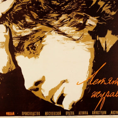 Original vintage Soviet movie poster for an award winning romantic war drama film that won the Palme d'Or at the 1958 Cannes Film Festival - The Cranes are Flying / Летят журавли - directed by Mikhail Kalatozov and starring Aleksey Batalov and Tatiana Samoilova, telling a story set during World War Two about two lovers who are separated when they join the war effort after Germany invades Russia in 1941. Dynamic illustration showing a close up sketch of the main character in muted browns and yellows with the title of the film in stylised orange text below. Horizontal. Good condition, restored tears and creases, backed on linen.