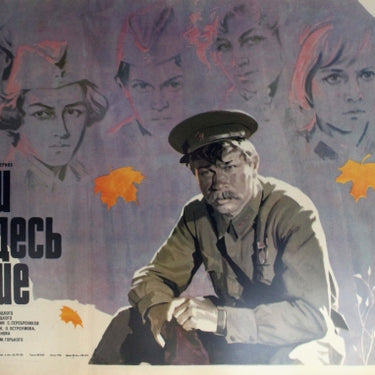 Original vintage movie poster for the 1972 Soviet film directed by Stanislav Rostotsky, based on Boris Vasilyev's novel, The Dawns Here Are Quiet (...А зори здесь тихие / A zori zdes tikhie). This World War Two drama film was nominated for an Oscar in the Best Foreign Language Film category in 1973. Horizontal. Very good condition, folded as issued.