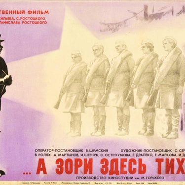 Original vintage movie poster for the Soviet film directed by Stanislav Rostotsky based on a novel by Boris Vasilyev - The Dawns Here Are Quiet ...А зори здесь тихие / A zori zdes tikhie - featuring a soldier looking towards a group of fighters in a star shaped light with the outline of trees on the pale background. This World War Two drama film was nominated for an Oscar in the Best Foreign Language Film category in 1973. Horizontal. Good condition, repaired tears, staining, foxing, creasing.