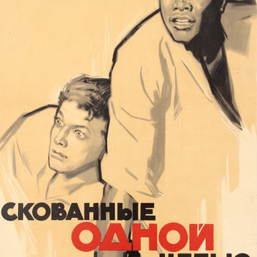Original vintage Soviet film poster for the USSR release of the Academy Award winning 1958 American drama The Defiant Ones under the title Bound With One Chain directed by Stanley Kramer and adapted by Harold Jacob Smith from the story by Nedrick Young (originally credited as Nathan E. Douglas) about two escaped prisoners - one white man and one black man - who are shackled together and must co-operate in order to survive ("They couldn't like each other less. They couldn't need each other more."), starring Tony Curtis and Sidney Poitier. Dynamic illustration showing the two main characters chained together with the stylised title text in black and red below. Very good condition, pin holes, light creasing, light staining.
