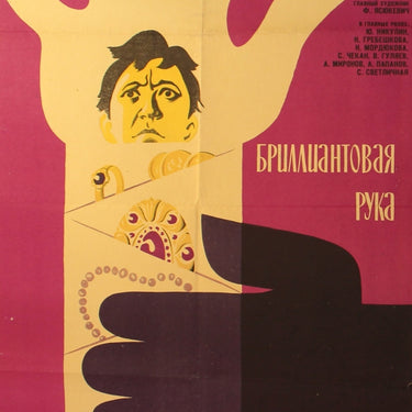 Original vintage film poster for a classic Soviet comedy, The Diamond Arm (Бриллиантовая рука / Brilliantovaya ruka), starring Yuriy Nikulin, Nina Grebeshkova and Andrey Mironov. Image of an arm in a white cast with diamonds and gold hidden inside, featuring the face of Yuri Nikulin (as Semyon Semyonych Gorbunkov / Senya). Good condition, folds, pinholes.