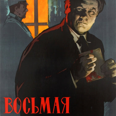 Original vintage Soviet movie poster for the 1961 Russian release of the 1959 Yugoslavian war drama film восьмая дверь / Osma Vrata / The Eighth Door about a university director who gets involved with the resistance movement, directed by Nikola Tanhofer and starring Milivoje Zivanovic, Neva Rosic, Nada Skrinjar, Radmila Durichin and Jovan Milicevic. Dynamic image depicting the professor holding a document in the foreground with a man in uniform standing by a lit up window in the background, the text below in stylised red and yellow letters. Good condition, folded as issued, cracks and minor tears in margins.