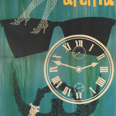 Original vintage Soviet cinema poster for the first release in Russia of the 1967 Czechoslovakian film The End of Agent W4C (конец агента) a spoof James Bond spy comedy directed by Vaclav Vorlicek and starring Jan Kacer (as the secret agent), Kveta Fialova, Jiri Sovak, Jan Libicek, Jiri Pleskot and Josef Hlinomaz. Great design showing the image of a bearded man wearing dark sunglasses against a green and blue shaded background with a white clock watch face on one side, a pair of lady's legs showing from behind the stylised title letters above and a small white dog sitting below. Fair condition, folded as issued, staple holes in margins, foxing, tears and losses in bottom margin.