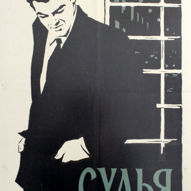 Original vintage Russian release movie poster for a 1959 Italian drama film directed by Luigi Zampa, The Magistrate (Il magistrato / released in the USSR as Sudya / The Judge), starring Jose Suarez. Image of a smartly dressed man with his hands in his suit jacket pockets looking down, standing in front of a window. Russian Release. Good condition, folds, pinholes.