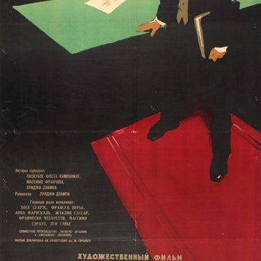 Original vintage Russian release movie poster for a 1959 Italian drama film directed by Luigi Zampa - The Magistrate / Il magistrato (released in the USSR as Sudya / The Judge) - starring Jose Suarez. Great artwork showing a man in a smart suit standing next to a desk with the text and title below. Good condition, folds, small tears, pinholes and creases on margins.