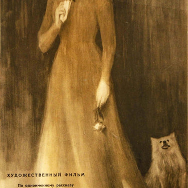 Original vintage movie poster for the romantic drama film directed by Iosif Kheifits - Дама с собачкой / The Lady with the Dog - inspired by the classic love story by the renowned Russian writer Anton Chekov about an adulterous affair between Dmitri Gurov (played by Aleksey Batalov) and Anna Sergeyevna (played by Iya Savvina) featuring an elegant lady wearing a long dress and black hat and holding a handkerchief with a small dog behind her, the bold title text above and credits below. Fair condition, folds, creasing, tears, paper loss, foxing.