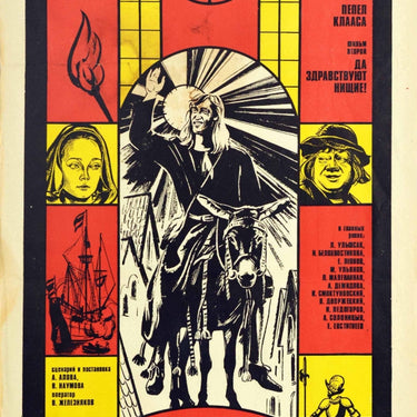Original vintage movie poster for a two part Soviet film The Legend of Till / Легенда о Тиле based on the 1867 novel The Legend of Till Ullenspiegel and Lamme Goedzak by the Belgian novelist Charles De Coster (1827-1879) featuring a stained glass window style design with a black and white illustration of Thyl riding a donkey along a street and raising his hand in a greeting in front of a shining sun in the centre with supporting characters from the film depicted on the sides with a ship flying flags, a burning flame torch and a guard in armour holding a sword by his side, the credits and text on the other red and yellow panes and on the black border above. Fair condition, folds, staining, tears, repaired tears.