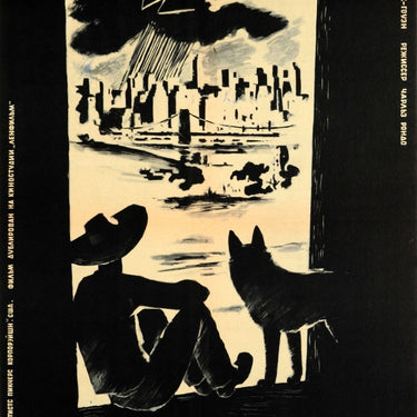 Original vintage Soviet movie poster for a 1958 American adventure film about an ownerless German Shepherd dog that rides freight trains and helps a lamb escape the slaughter house - The Littlest Hobo - directed by Charles R. Rondeau and starring London the dog, Buddy Joe Hooker, Wendy Stuart and Carlyle Mitchell. Fantastic stylised black and white illustration depicting a man in a hat sitting next to a dog with the view framed to show sunshine over a storm cloud with lightening and rain pouring down on a city lined with skyscrapers in the distance, the title text in swirling stylised letters below. Good condition, restored tears, restored pinholes, restored folds, backed on linen.