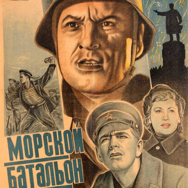 Original vintage Soviet film poster for a war movie The Marine Battalion / Морскоии Батальон about Soviet Baltic Sea Fleet marines defending Leningrad during World War Two from 1941-1944, directed by Aleksandr Faintsimmer and Adolf Minkin, written by Aleksandr Shtein and starring Aleksandr Larikov, Mariya Domashyova and Andrei Abrikosov. Dynamic illustration featuring a sailor in uniform holding a rifle gun and grenade with a soldier in the centre and a silhouette of a statue with fireworks in the background and a sailor manning a machine gun in front of a lady below, the title diagonally in blue letters on the side. Good condition, folds, tears, pin holes and light creasing.