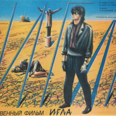 Original vintage movie poster for a Soviet thriller film The Needle (Игла / Igla) directed by Rashid Nugmanov and starring the Soviet rock musician from the band Kino Viktor Tsoi (Viktor Robertovich Tsoy; 1962-1990) as the main character Moro and Marina Smirnova as his drug addicted girlfriend Dina; one of Kazakhstan's first new wave films. Colourful artwork featuring the character Moro wearing fashionable 1980s clothing and sunglasses with gloves, standing under a scorching desert sun with a lady lying down and man sitting on the cracked dry earth behind him, a statue and shipwreck visible in the background and the title text in tall blue letters in the foreground, the letter L stretched out as the shadow of Moro. Horizontal. Good condition, printing defect resulting in slight doubling of image, creases in margins.