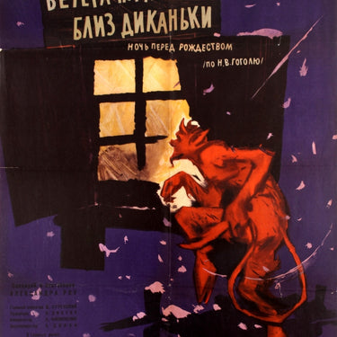 Original vintage Soviet movie poster for a fantasy film The Night Before Christmas also known as Evenings on a Farm near Dikanka / Ночь перед Рождеством Вечера на хуторе близ Диканьки directed by Aleksandr Rou based on a collection of short stories by the notable dramatist Nikolai Gogol (1809-1852) about a blacksmith who pursues a beautiful lady with the help of the Devil on Christmas Eve. Great illustration depicting a red devil looking through a window with snow falling against a purple background, the stylised title text against the wooden window frame above the shutters. Good condition, fold marks,tears, creasing.