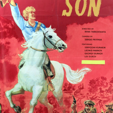 Original vintage film poster for The Peasant's Son featuring a young man holding up a rifle gun and riding a white horse over fire flames against a pink red background with soldiers fighting below and in the background, the title text in English above and the credits on the side.