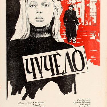 Original vintage Soviet movie poster for the 1984 drama film Чучело / Chuchelo / The Scarecrow about a school girl who gets bullied by her classmates, directed by Rolan Bykov and starring Christina Orbakaite, Yury Nikulin, Elena Sanaeva and Rolan Bykov. Great artwork featuring a black and white illustration of the young girl with an elderly man in the background walking through an arch sketched in red and white, the title across the image in the foreground in stylised black letters. Good condition, folded as issued, small tears in bottom margin.