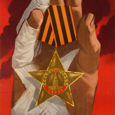 Original vintage Soviet movie poster for a documentary film about World War Two - The Soldier Was Walking - featuring interviews with Soviet soldiers and officers, poems read by the author and war poet Konstantin Simonov (1915-1917) and documentary footage. Dynamic design featuring the bandaged hand of a soldier holding up a Soviet medal with the Kremlin inside a star with the black and orange St George's ribbon on top, set against a red background with black smoke and the title below in black and white letters. Good condition, folded as issued, tears and creases in margins.