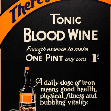 Original vintage medicinal drink advertising poster: There's Iron in Tonic Blood Wine - enough essence to make one pint only costs 1'/ - a daily dose of iron means good health physical fitness and bubbling vitality - restores the appetite and strength - makes new blood. Colourful illustration featuring a bottle of home made Tonic Blood Wine on a table with a glass and a packet of essence against a black background with the stylised lettering above and below. Very good condition, restored folds and minor tears on margins, backed on linen.
