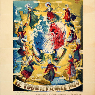 Original vintage sport poster - Le Tour De France 1949 Nancy Ville Etape Tourisme Art et Histoire / City stage Tourism Art and History - featuring artwork by Alfred Selig (1907-1974) depicting a racing cyclist in Nancy against a blue, white and red background representing the French flag, surrounded by ladies in traditional dress holding hands and dancing in a circle with the places marked on the race route on the map of France. The 36th Tour de France was held from 30 June to 24 July 1949. Good condition, restored folds, staining, browning, blind embossed text on right edge, backed on linen.