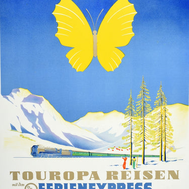 Original vintage skiing travel poster advertising Touropa Reisen mit dem der Ferienexpress im zeichen des schmetterlings / Touropa Travel with the Holiday Express under the sign of the butterfly. Artwork by Ottomar Anton (1895-1976) featuring a large yellow butterfly in the blue sky above an image of people standing with their skis by trees and watching a train pass in front of the snowy mountains in the background. Good condition, restored tears, minor staining, backed on linen.