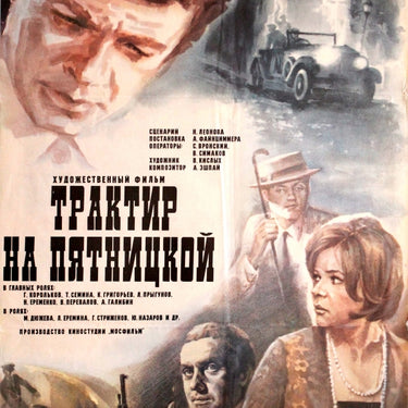 Original vintage Soviet movie poster for a mystery crime film, Traktir na Pyatnitskoy (Трактир на Пятницкой / The Eating House on Pyatnitskaya), starring Gennadi Korolkov, Tamara Syomina and Konstantin Grigorev. Great design featuring characters in action from the film including a fight scene, a man wearing a hat and holding a walking stick, a man holding a pistol gun and a smartly dressed lady wearing a long necklace with a car driving by one of Moscow's historic buildings in the top right and the text in the centre. Good condition, folds, small losses on right margin.
