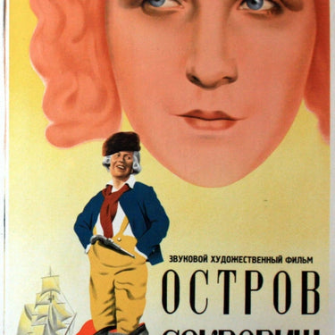 Original vintage Russian movie poster for an adaption of Robert Louis Stevenson's novel Treasure Island / Остров сокровищ, a children's adventure film released in the Soviet Union in January 1938, directed by Vladimir Vaynshtok and starring Klavdiya Pugachyova, Mikhail Klimov and Osip Abdulov. Great image of a smiling pirate wearing long boots and a hat and holding a pistol on a sandy beach with a tall ship in full sail at sea in the background and the face of a lady above, the title text on the side and credits below.