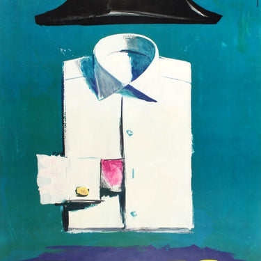 Original vintage mid-century advertising poster for Tuch AG, a Swiss brand of fashion clothing, featuring a great Napoleon style design by the renowned graphic artist Hans Looser (1919-1988) of a neatly folded white shirt with a cufflink on one arm tucked in the front and a black hat above, against a blue background with the title below in yellow letters. Tuch AG was founded in 1922 by Adrian Schild; in 1972 the company was renamed Schild AG. Printed in Switzerland by Paul Bender, Zollikon-Zürich. Large size. Very good condition, light creases on top and bottom margins.