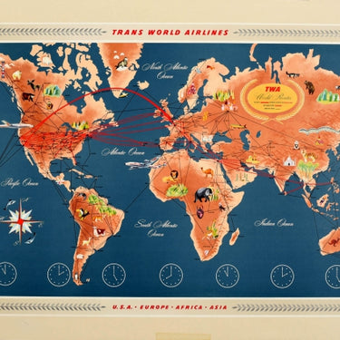 Original vintage travel advertising map poster for TWA / Trans World Airlines USA Europe Africa Asia featuring a pictorial map with the airline routes marked around the world and various places of interest and animals shown from the different countries and continents including the Great Wall of China, ancient Roman ruins, the Moscow Kremlin and a moose in Canada, penguin in South America, kangaroo in Australia, a lion, elephant and giraffe in Africa, fish, trees, mountains and a walrus by the North Atlantic Ocean with clocks indicating the time zones below and compass point on the Pacific Ocean, the title text surrounded by a wreath design over Russia and around the decorative border. Trans World Airlines (TWA) was a major American airline from 1924-2001, when it was acquired by American Airlines. Horizontal. Good condition, restored tears, staining from tape on margins, backed on linen, linen trimmed to edge of poster.